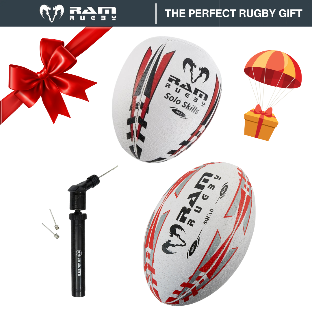 RAM Rugby Geschenkset – Mannschaftstraining Ball + Solo Skill Ball + Mini Pumpe – Größe 3, 4 oder 5 – 3D Grip